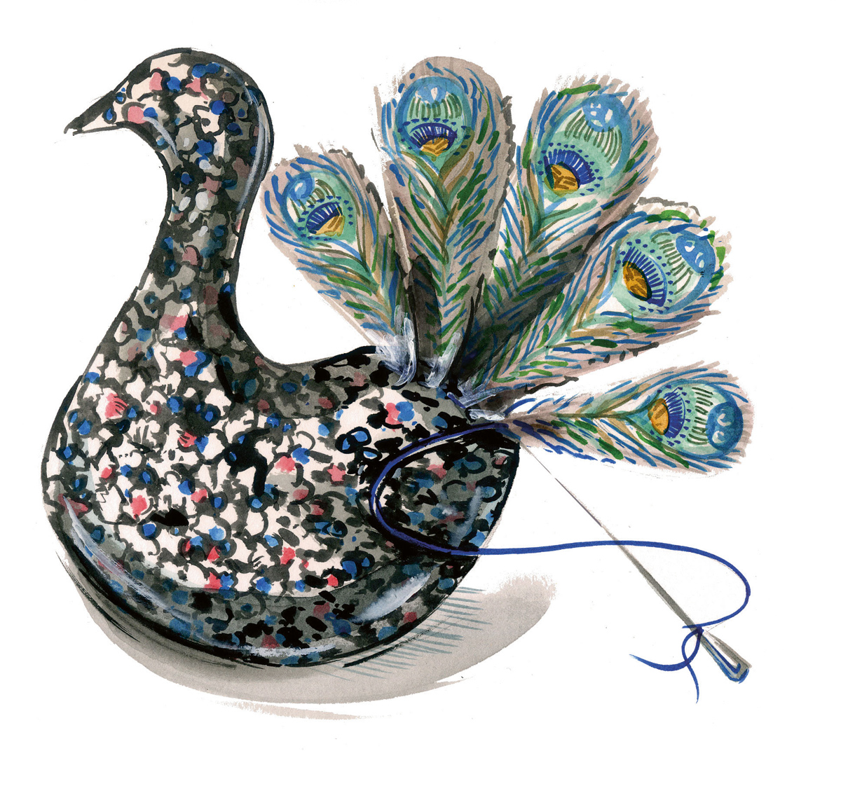 Чтобы прикрепить большие и средние перья понадобиться проволока длиной 15 см. С одной стороны проволока будет загнута в виде петли. Перья уложить на ткань и настрочить прямыми стежками. Когда будете притачивать большие и средние меду ними кладите проволоку. Теперь перья нужно вырезать. Затем эти перья нужно пришить к туловищу павлина.