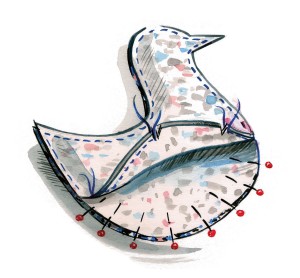 Чтобы выкроить павлина необходимо сделать две детали туловища, а также основания. Эти детали нужно сделать из бумаги и вырезать. Потом выкроить их из ткани. У вас должно получить 2 детали туловища и одна деталь основания с припусками. Из той ткани, на которой павлиньи перья вырезать 7 больших, 6 средних и около 4 маленьких перьев. Но вырезать не нужно точно по рисунку, необходимо, чтобы перья имели каплевидную форму.