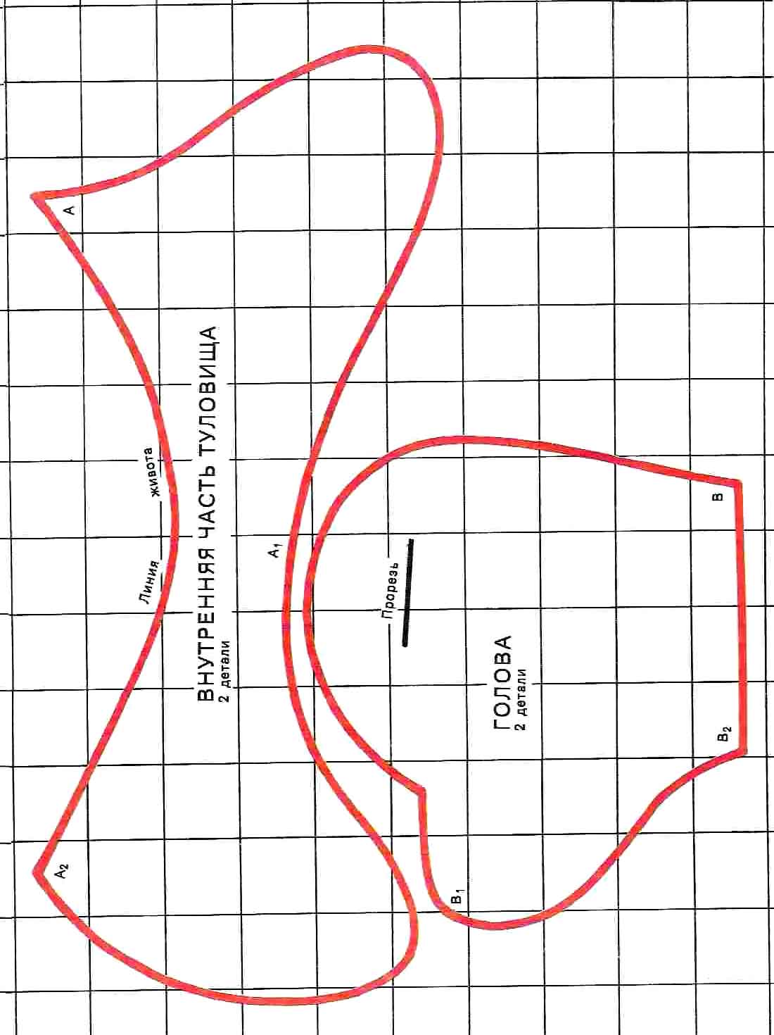 Вырисовываем и вырезаем детали из картона, делаем шаблоны. Чтобы было легче с размерами, просто откройте выкройку, приставьте бумагу к монитору и обведите контуры, потом переведите это на картон, если картон не подойдёт и не будет видно с монитора. После того как сделали шаблоны, обрисовываем их на материале который будем использовать, вырезаем. Внутренние и боковые части тела сшиваем вручную с изнаночной стороны швом «через край» как на картинке, по линиям А, А1, А2. То что получилось тем же швом зашиваем спину по линиям Б, А2 и живота А, А2, выворачиваем лицевой стороной и хорошенько набиваем.